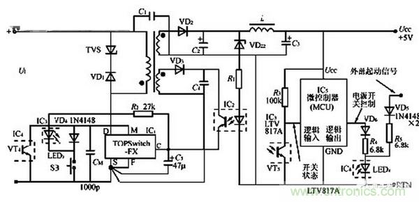 【導(dǎo)讀】開關(guān)電源部分主要由TOP Switch FX(IC1)、光耦合器(IC2)組成??刂齐娐穭t包括微控制器(MCU)、兩片LTV817A線性光耦合器(IC3、IC4)、按鈕開關(guān)SB。