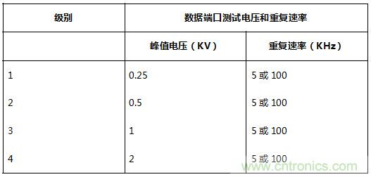 IEC 61000-4-4規(guī)定了不同環(huán)境狀況下的電壓測試級別,分為4級。同時規(guī)定了不同測試級別對應的測試電壓和脈沖重復速率。