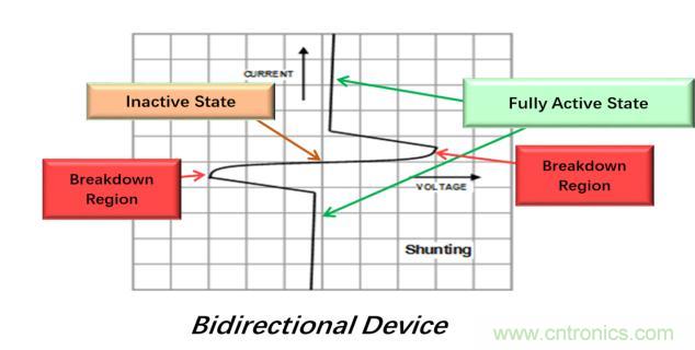 TISP的非線性電壓-電流特性通過轉移產(chǎn)生的電流來限制過壓。作為晶閘管,TISP具有非連續(xù)電壓-電流特性,它是由于高電壓區(qū)和低電壓區(qū)之間的切換動作而導致的。在TISP器件切換到低電壓狀態(tài)之前,它具有低阻抗接地路徑以分流瞬變能量,雪崩擊穿區(qū)域則導致了箝位動作。