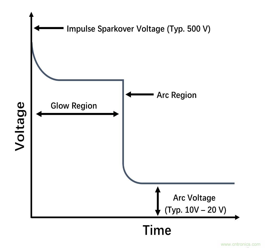 GDT主要用作主保護器件,提供低阻抗接地路徑以防止過壓瞬變。當瞬變電壓達到GDT火花放電電壓時,GDT將從高阻抗關閉狀態(tài)切換到電弧模式。在電弧模式下,GDT成為虛擬短路,提供瞬變開路電流接地泄放路徑,將瞬變沖擊電流從受保護器件上轉移開。