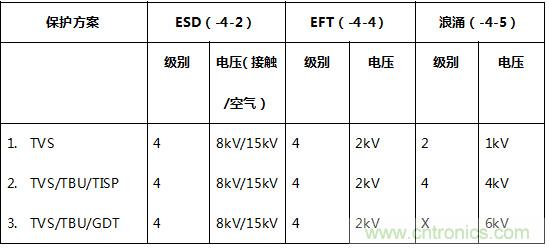 按照以上的規(guī)范要求和設計原則,下面我們提供三種不同級別的EMC防護解決方案,這些方案都已經(jīng)經(jīng)過了第三方獨立EMC兼容性測試的認證。方案中用到的元器件包括: