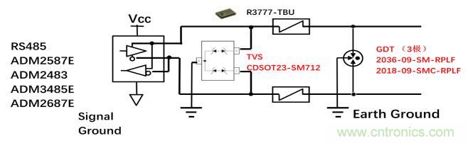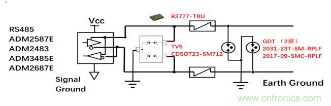 在這個方案中,由TVS(CDSOT23-SM712)提供次級保護, TISP(TISP4240M3BJR-S)則提供主保護,主保護器件和次級保護器件之間的協(xié)調(diào)以及過流保護是利用Bourns專利技術的過流保護器件TBU(TBU-CA065-200-WH)實現(xiàn)的。