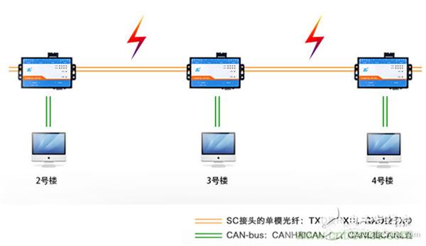 有沒有方法能徹底解決雷擊造成的隱患呢?答案是肯定的,只要數(shù)據(jù)的傳輸不依賴電信號就能完全隔離掉雷擊的危害。我們可以把CAN總線室外的部分或者說容易受到干擾的部分使用光信號傳輸,這種方法目前已經(jīng)廣泛應(yīng)用于高速鐵路、地鐵、煤礦、醫(yī)療、航空航天、樓宇安防、電梯控制等場合。