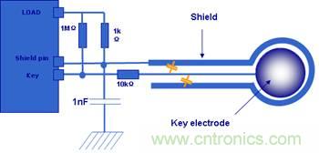 在STM8S的解決方案中,ST提供了感應(yīng)電極和走線的設(shè)計(jì)規(guī)范和如圖3所示的Driven Shield功能(在Shield線上提供與按鍵管腳相同的驅(qū)動(dòng)信號(hào),電極與Shield之間的寄生電容就不會(huì)被充放電),能有效地減少感應(yīng)電極走線的寄生電容對(duì)按鍵靈敏度的影響。