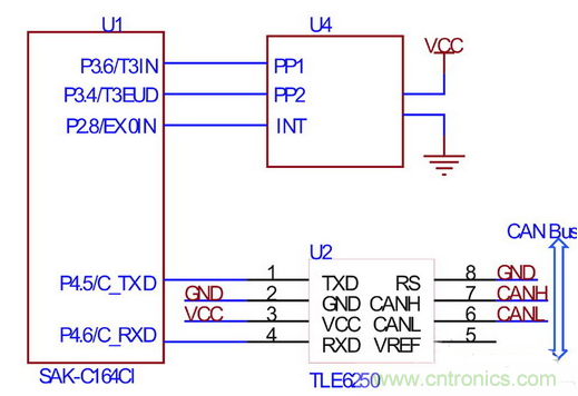C164CI 與方向盤轉角傳感器的接口電路如圖2所示。片內(nèi)內(nèi)置增量編碼的正交解碼器,該解碼器使用定時器3的兩個引腳(T3IN、T3EUD)作為正交脈沖的輸入,在正確設置相關寄存器后,定時器3的數(shù)據(jù)寄存器的值與方向盤轉角成正比,故可方便的計算轉角,本文所使用的方向盤轉角傳感器每一圈對應44個脈沖,設定時器3的數(shù)據(jù)寄存器為T3,則絕對轉角為。