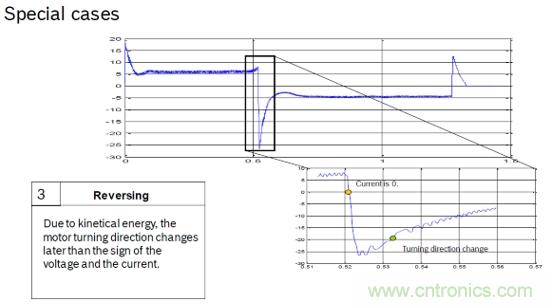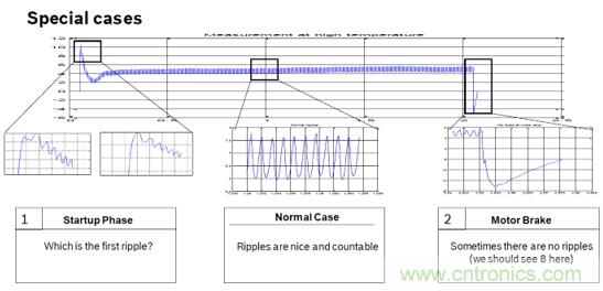 由于電機在啟動,停止,反轉(zhuǎn),堵轉(zhuǎn)時的紋波特征不明顯。如圖5和圖6,不能精準的計數(shù)紋波個數(shù)。只能通過算法進行補償。這樣紋波計數(shù)必然和實際的必然存在誤差。而這誤差隨著車窗操作次數(shù)的增加,誤差也會跟著累積。