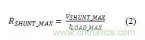 計算最大分流電阻。當來自負載(ILOAD)的電流流過分流電阻器(RSHUNT)時,分流電阻器上會形成一個電壓電位(VSHUNT)。VSHUNT被視為系統(tǒng)負載的“接地端”。因此,建議將VSHUN的最大負載電流保持在100mV以下,以避免在與其它具有真正0V接地的系統(tǒng)連接時出現(xiàn)問題。公式2用于計算RSHUNT值: