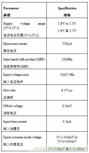 TLV906x系列高性能通用放大器可用于成本敏感型的低側(cè)電流感應(yīng)系統(tǒng),因為其增益帶寬(10MHz)、壓擺率(6.5V/µs)、偏移電壓(0.3mV)以及輸入共模電壓范圍為負電源電壓以下100mV。下表中列出了一些TLV906x系列的技術(shù)參數(shù)。