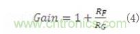 公式4用于計算放大器反饋網(wǎng)絡(luò)中的電阻RF和RG的大小,以此來設(shè)置公式3中計算出的增益: