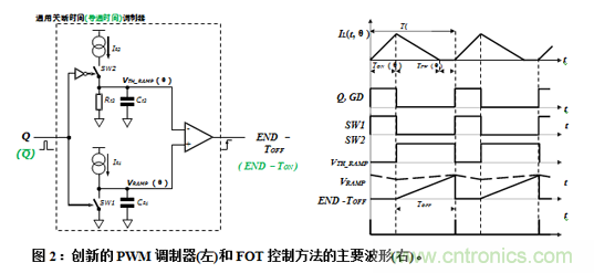 本文介紹一種創(chuàng)新的自適應(yīng)穩(wěn)壓器(AC/DC或DC/DC)脈寬調(diào)制器(PWM),基于“固定關(guān)斷時(shí)間(FOT)”或“恒定導(dǎo)通時(shí)間(COT)”控制方法,可以在全工況下(例如,滿負(fù)載CCM或中低負(fù)載DCM模式,寬輸入輸出電壓)以恒定開關(guān)頻率工作,無轉(zhuǎn)換器的寄生參數(shù)(例如,功率開關(guān)和濾波電感器的電阻)的負(fù)面影響。此外,本文提出的調(diào)制器電路與轉(zhuǎn)換器拓?fù)錈o關(guān)(升壓、降壓、反激式等),只與功率開關(guān)管柵極驅(qū)動邏輯信號(GD)有關(guān),節(jié)省芯片引腳數(shù)量,且/或降低設(shè)計(jì)復(fù)雜程度。