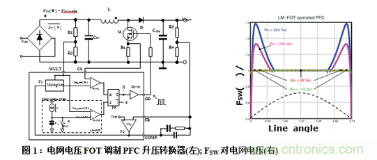 例如,用FOT方法控制CCM PFC前級升壓穩(wěn)壓器,導(dǎo)致開關(guān)頻率隨電網(wǎng)電壓和負(fù)載條件而發(fā)生明顯變化[1]。按照實(shí)時(shí)電網(wǎng)電壓調(diào)制關(guān)斷時(shí)間,可以降低開關(guān)頻率(TOFFKt Vin, pksinθ), 如圖1所示,只要升壓級是CCM模式,最終開關(guān)頻率是恒定的[2],如圖1右圖所示。