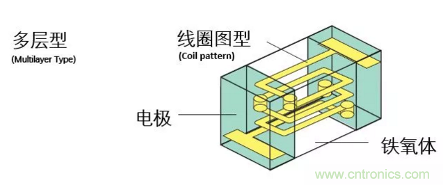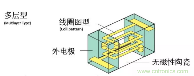多層片狀電感的制作工藝:將鐵氧體或陶瓷漿料干燥成型,交替印刷導(dǎo)電漿料,最后疊層、燒結(jié)成一體化結(jié)構(gòu)(Monolithic)。