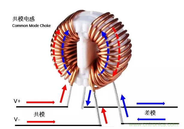 換一個方式理解:當V+上流過一個頻率的共模干擾,形成的交變磁場,會在另一個線圈上形成一個感應(yīng)電流,根據(jù)左手定則,感應(yīng)電流的方向與V-上共模干擾的方向相反,就抵消了一部分,減小了共模干擾。