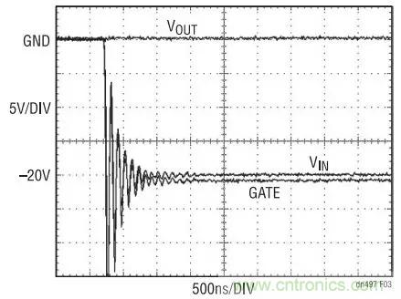 圖 3 示出了當(dāng) VIN 帶電插入至 –20V 時出現(xiàn)的狀況。 在連接的前一刻, VIN 、VOUT 和 GATE 以地電位為起始點。由于 VIN 和 GATE 連接線的寄生電感之原 因, VIN 和 GATE 引腳上的電壓將顯著地變至 –20V以下。外部 MOSFET 必須具有一個可安全承受該過沖的擊穿電壓指標(biāo)。