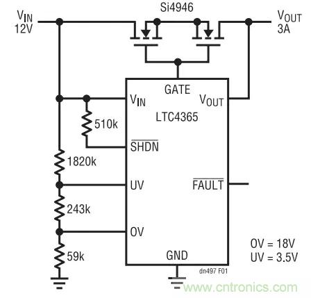 圖 1 示出了一款完整的應(yīng)用電路。一個阻性分壓器負(fù)責(zé)設(shè)定用于負(fù)載與 VIN 連接 / 斷接的過壓(OV)和欠壓 (UV) 跳變點。如果輸入電源漂移至該電壓窗口之外,則 LTC4365 將迅速把負(fù)載與電源斷接。