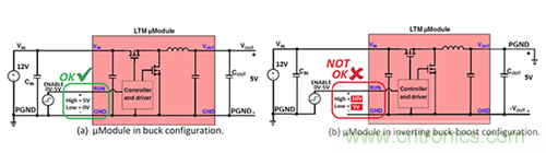 圖1.僅僅幾個(gè)連接變化將一個(gè)降壓μModule穩(wěn)壓器(a)轉(zhuǎn)換為一個(gè)負(fù)輸出穩(wěn)壓器(b)