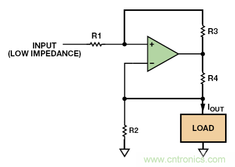 目前為止,我們討論的電路都是單極性的——電流在一個(gè)方向上流動(dòng)——但雙極性電流電路也是可行的。最簡單、使用最廣泛的當(dāng)數(shù)Howland電流泵,如圖 9 所示。這款簡單的電路有很多問題:它對電阻匹配的精度要求極高,以獲得高輸出阻抗;輸入源阻抗會增加R1 電阻,因此它的數(shù)值必須非常低以最大程度降低匹配誤差;電源電壓必須比最大輸出電壓高得多;并且運(yùn)算放大器的CMRR性能必須相對良好。