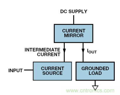若電流或電壓輸入?yún)⒖嫉?,則必須使用電平轉(zhuǎn)換。有多個(gè)電路可以實(shí)現(xiàn);而圖 8 中的系統(tǒng)在很多場合下都適用。這款簡單的電路采用接地電流源驅(qū)動(dòng)直流電源上的電流鏡,從而驅(qū)動(dòng)負(fù)載。注意,電流鏡可能有增益,因此信號電流不需要像負(fù)載電流那么高。