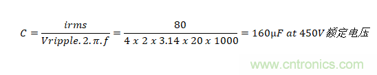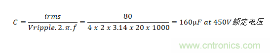 如果僅需要電容器來控制電動汽車動力系統(tǒng)等直流線路上的紋波電壓,則在選擇電容器時將會呈現(xiàn)顯著不同。 總線電壓可能與以前一樣為400V,但由采用電池供電,因此不存在穿越需求。在下游轉(zhuǎn)換器以20kHz的開關(guān)頻率提取80Arms脈沖電流時,將紋波限制在4Vrms以內(nèi)是非?,F(xiàn)實的, 所需的電容是:
