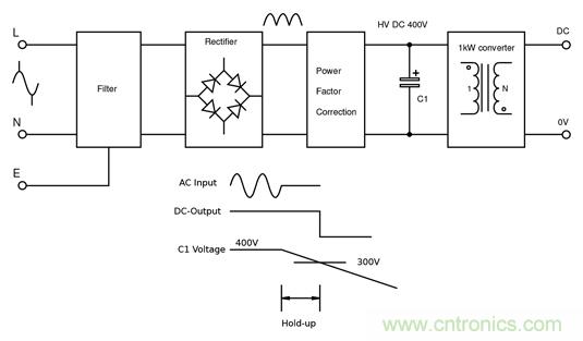 例如,對于用作1kW離線轉(zhuǎn)換器的大容量電容,通過比較電解電容器和薄膜電容器可以清楚地說明這兩種類型電容器之間的特性差異。 如圖1所示,該轉(zhuǎn)換器具有功率因數(shù)校正前端,且具有400V的標(biāo)稱直流總線電壓(Vn)。