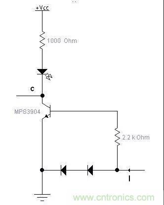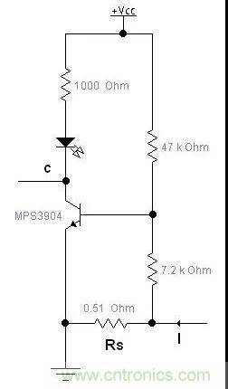 如果簡單的用三極管導(dǎo)通與截止來檢測電流的話,三極管開啟要0.7V左右,電流比較小的時候需要串比較大的采用電阻,同時浪費較大的反饋電壓,如上圖方法,可以用比較小的電阻,消耗很小的電壓就能檢測到電流I,通過調(diào)整三極管基機電阻可以調(diào)整檢測的靈敏度。這個電路可以用在充電器等需要顯示有沒有充電電流的地方。