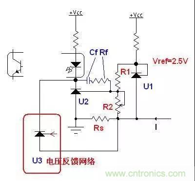 TL431 價格低廉,在開關(guān)電源的反饋環(huán)路大量應(yīng)用,但其FB電壓為2.5V,直接用做電流反饋時要很大的采樣電阻,浪費電壓。圖中用兩個TL431實現(xiàn)電流反饋,可以用比較小的采樣電阻實現(xiàn)精密的電流反饋,如果還有電壓反饋網(wǎng)絡(luò),再并上U3的電壓反饋電路。