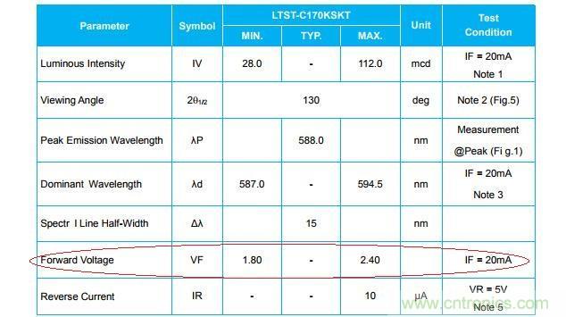 從數(shù)據(jù)表可看出,當(dāng)LED燈流過20mA時(shí),燈的壓降在1.8~2.4V之間。那我們?cè)O(shè)計(jì)的LED燈要流過多少電流呢?其實(shí)20mA的時(shí)候已經(jīng)非常亮了,如果只是為了普通的指示,根據(jù)工程經(jīng)驗(yàn)流過5~10mA就可以了,我們?nèi)?0mA,LED燈壓降約為1V。