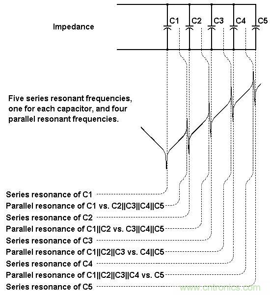 請記住,這五種電容每一個都不是單獨的電容器,而是一個串聯(lián)組合,包括電容器、電感器和電阻器??傊?,它們由串聯(lián)的RLC電路構(gòu)成,將在串聯(lián)諧振頻率(SRF)處表現(xiàn)出串聯(lián)諧振,其中SRF=1/(2 × π ×√ (L × C))。對于如上所述并聯(lián)連接的五個電容的組合,將會有五個串聯(lián)諧振頻率,并且還會有四個并聯(lián)諧振頻率,如圖1所示。