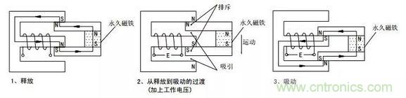 由永久磁鐵保持釋放狀態(tài),加上工作電壓后,電磁感應使銜鐵與永久磁鐵產(chǎn)生吸引和排斥力矩,產(chǎn)生向下的運動,最后達到吸合狀態(tài)。