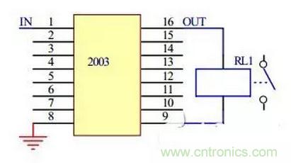 當2003輸入端為高電平時,對應的輸出口輸出低電平,繼電器線圈兩端通電,繼電器觸點吸合;