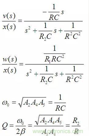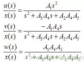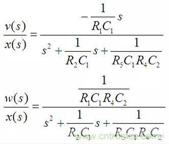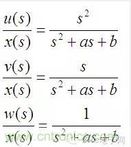 上面三個(gè)式子分別對(duì)應(yīng)高通、帶通和低通濾波器,如果將u、v、w三路信號(hào)加權(quán)疊加則可以組成任意的二階系統(tǒng)。