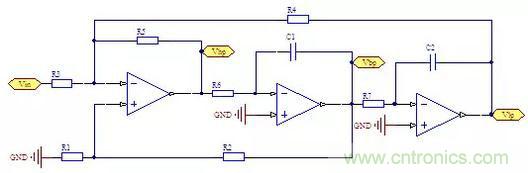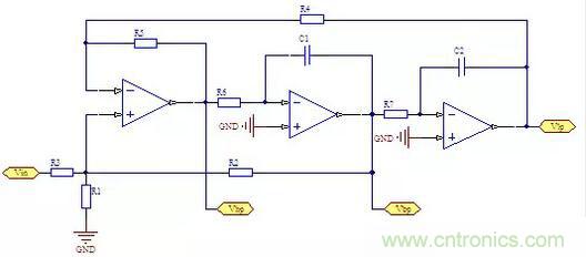 帶阻信號(hào)如果再與低通信號(hào)相加,就能夠組成低通帶阻型或高通帶阻型。下面是電路原理圖。
