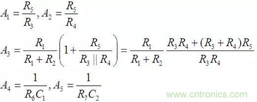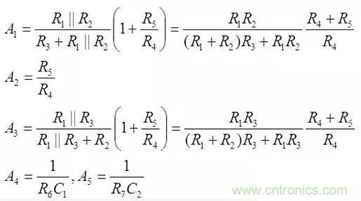 列寫(xiě)系統(tǒng)各個(gè)通路的傳遞函數(shù)也與正向輸入型KHN濾波器完全相同,這里重復(fù)如下: