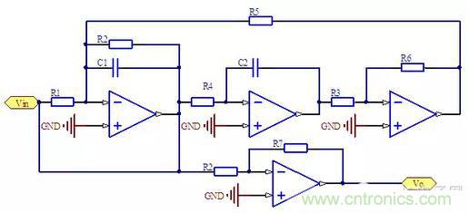 原始信號(hào)減去帶通信號(hào)就稱為帶阻信號(hào)了,因此再增加一個(gè)運(yùn)放就可以實(shí)現(xiàn)帶阻型濾波器。