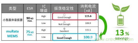 由于其低ESR的特性,可降低IC增益。因此,可抑制振蕩電路的消耗電流,實現(xiàn)整個設(shè)備的低功耗。