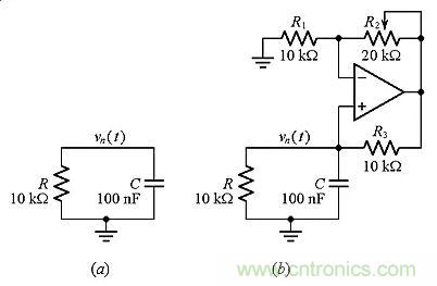 無論怎樣選擇R和C的值,該電路的極點(diǎn)將始終為負(fù)。我們希望找到控制它的方法,以便將其驅(qū)動為零甚至使其成為正的。圖5b示出的電路可以完成這項(xiàng)工作。非反相放大器檢測vn并輸出電壓: