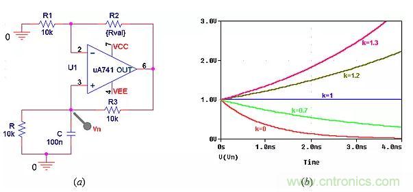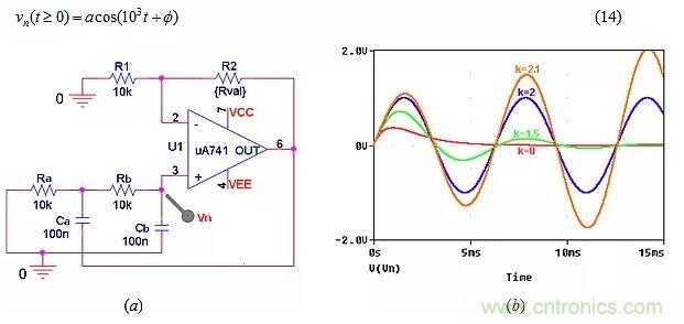 ● 將k提高到2以上,使運(yùn)算放大器注入的能量超過端口電阻可以消耗的能量,引起發(fā)散振蕩,如圖9b中k=2.1所示。振蕩將持續(xù)增長到運(yùn)算放大器飽和為止。