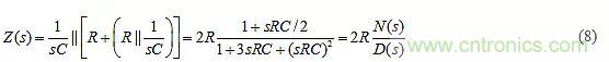 為簡單起見,假設(shè)圖8a的RC對完全相同??梢钥闯?,無論我們怎樣選擇元件值,該電路的極點(diǎn)將始終為負(fù)實(shí)數(shù)。