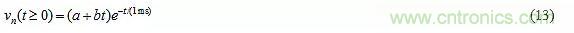 比較公式(8)和(9),我們發(fā)現(xiàn)圖8a的電路具有:ζ=1.5和ω0=1/(RC)=1/(1ms)。代入公式(10)得到極點(diǎn)對p1=-1/(0.3818ms),p2=-1/(2.618ms),表示vn(t)由一對指數(shù)衰減組成,因?yàn)殡娮柘牧舜鎯υ陔娙葜械碾娔堋?/div>