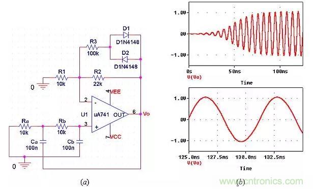 在圖11a中,電源接通時,兩個二極管仍然關(guān)閉,因此k=R2/R1=22/10=2.2,表明振蕩增加。隨著振蕩的增加,二極管在交替的半周期內(nèi)逐漸導(dǎo)通,所以k=[R2||(R3+rd)]/R1,其中rd是動態(tài)二極管電阻(rd隨二極管電流而減?。T趓d<<R3的極限情況下,我們將得到k=(22||100)/10=1.8,表示電路可在1.8<k<2.2的范圍內(nèi)調(diào)整k的值,這包括k=2.0時持續(xù)振蕩達(dá)到所需幅度的情況。