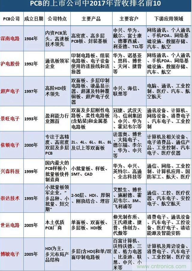 超聲電子:成立于1997年,高階HDI技術(shù)領(lǐng)先。產(chǎn)品包含雙面及多層印制電路板、液晶顯示器、超薄及特種覆銅板、超聲電子儀器等,是蘋(píng)果、博世、法雷奧等全球知名企業(yè)長(zhǎng)期供應(yīng)商。PCB為主要營(yíng)收來(lái)源,2017年?duì)I收占比53%。