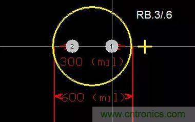 電解電容封裝則以RB標(biāo)識,常見封裝有:RB.2/.4、RB.3/.6、RB.4/.8、RB.5/1.0,符號中前面數(shù)字表示焊盤中心孔間距,后面數(shù)字表示外圍尺寸(絲印),單位仍然是英寸,如下圖(RB-.3/.6):
