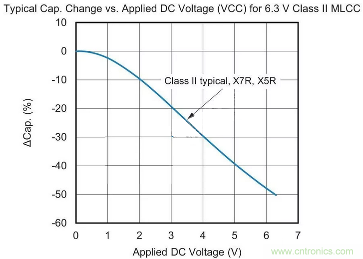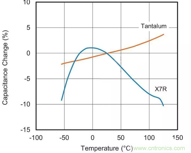 用于替換最可能的MLCC候選者采用“II類”電介質(zhì)材料。這種II類陶瓷(通常為X7R或X5R)的容值會(huì)在溫度范圍內(nèi)變化,這種特征稱為電容溫度系數(shù)(TCC),參見圖1。