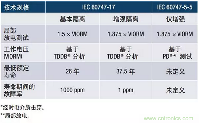 IEC 60747-17 (DIN V VDE V 0884-11)明確定義了采用感性和容性技術(shù)的絕緣,而公認(rèn)的IEC 60747-5-5標(biāo)準(zhǔn)則被用來定義采用光耦合器技術(shù)的絕緣。然而,IEC 60747-5-5沒有規(guī)定通過TDDB分析來確定連續(xù)工作電壓和使用壽命。它依賴局部放電電壓測試來確定工作電壓,但并未定義器件的工作壽命。因此,感性和容性技術(shù)的最低額定壽命為37.5年,而對光耦合器隔離器則未作規(guī)定。
