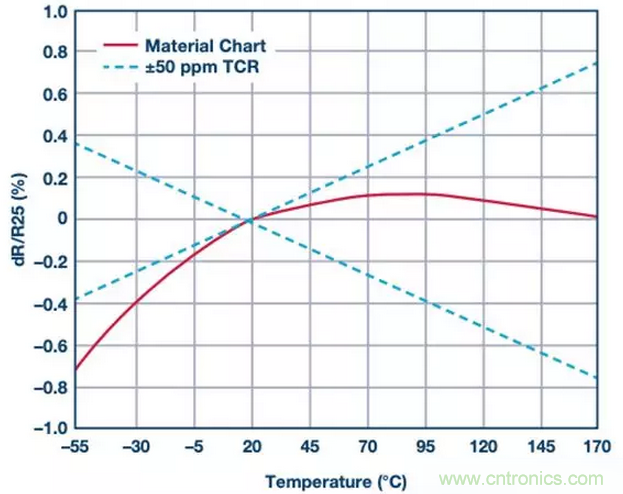 由鎳、銅、錳特殊合金制成的阻性元件的電阻溫漂曲線呈拋物線形狀,如圖2所示。對于電流檢測應(yīng)用,這些合金是精度最高的材料。圖2還顯示了Bourns CSS4J-4026R型電阻溫漂的上限和下限,對應(yīng)于50 ppm/°C的溫度系數(shù)。此差距是由電阻的銅引腳引起的,銅具有很高的TCR (4000 ppm/°C),導(dǎo)致溫漂增加。