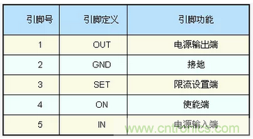 我們?nèi)砸訟AT4610為例,說明電子開關(guān)實(shí)現(xiàn)過流保護(hù)的工作原理。AAT4610采用SOT-23塑料封裝(如圖1),5個(gè)引腳的定義見表1。