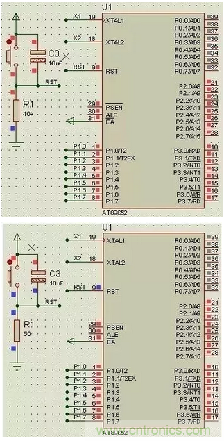 大家可以看到復(fù)位電路中電阻R1=10k時(shí)RST是高電平 ,而當(dāng)R1=50時(shí)RST為低電平,很明顯R1=10k時(shí)是錯(cuò)誤的,單片機(jī)一直處在復(fù)位狀態(tài)時(shí)根本無法工作。出現(xiàn)這樣的原因是由于RST引腳內(nèi)含三極管,即便在截止?fàn)顟B(tài)時(shí)也會(huì)有少量截止電流,當(dāng)R取的非常大時(shí),微弱的截止電流通過就產(chǎn)生了高電平。