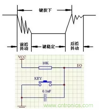 消除方法有兩種:軟件除抖和硬件除抖,其中硬件除抖是應(yīng)用了電容對高頻信號(hào)短路的原理。