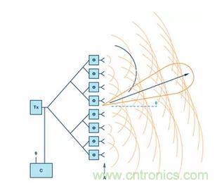 圖1展示了如何通過調(diào)整每個(gè)天線中信號(hào)的相位,將有效波束控制在線性陣列的目標(biāo)方向上。結(jié)果,陣列中的每個(gè)天線都具有獨(dú)立的相位和幅度設(shè)置,以形成期望的輻射圖。由于沒有機(jī)械運(yùn)動(dòng)部件,所以很容易理解相控陣中波束快速轉(zhuǎn)向的屬性。