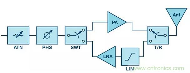 圖4:相控陣天線的典型RF前端示例。
